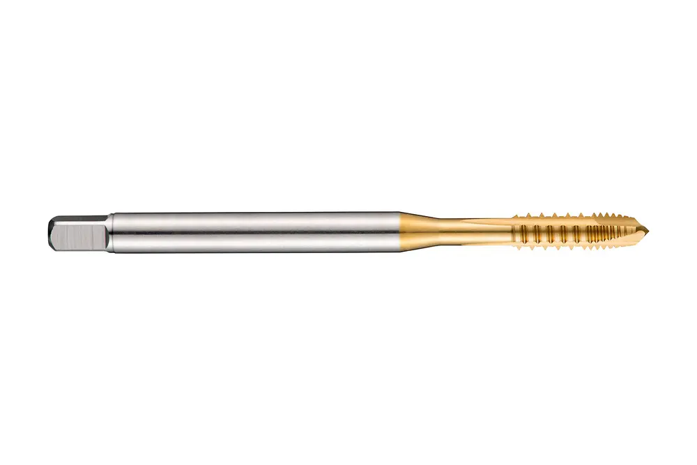 Метчик со спиральной подточкой и фаской формы B с заходной частью 3,5-5xP для метрической резьбы ISO M3 с шагом 0,50 мм и классом точности 6H, размеры по стандарту DIN 371 с хвостовиком 3,5 мм и квадратным приводом 2,7 мм, из порошковой стали HSS-E с покрытием TiN для нарезания резьбы 3xD в сквозных отверстиях в автоматической обработке на станке из углеродистой и легированной стали, а также деформируемых сталей, меди и медных сплавов.