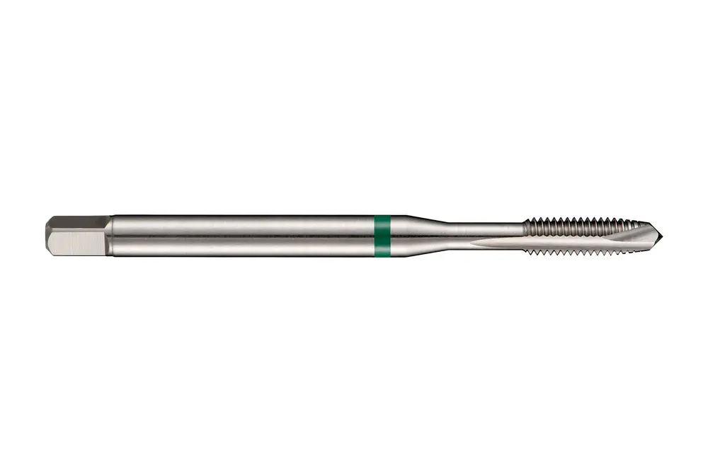 Метчик со спиральной подточкой Green Shark с фаской формы B, вторым заходом 3,5-5xP, для метрической резьбы ISO M5 с шагом 0,80 мм и классом точности 6H, размеры по стандарту DIN 371, с хвостовиком 6,0 мм и приводным квадратом 4,9 мм, изготавливается методом порошковой металлургии из быстрорежущей стали HSS-E с блестящей поверхностью для нарезания сквозной резьбы 2,5xD в цветных металлах.