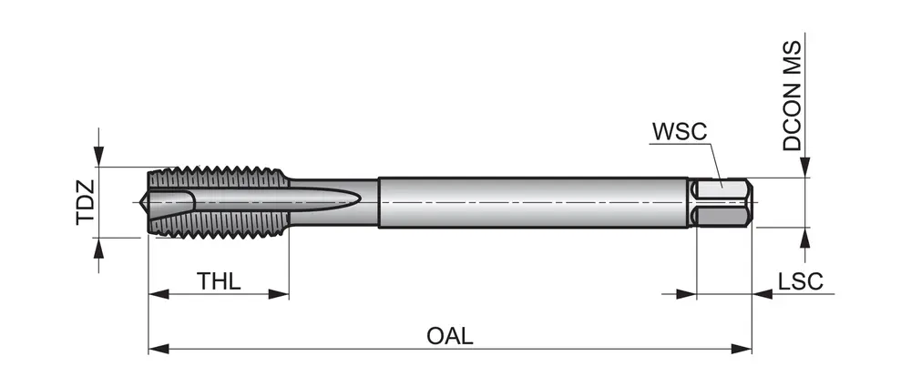 Метчик со спиральной подточкой и фаской формы B, со вторым заходом 3,5-5xP, для метрической мелкой резьбы ISO M10 с шагом 1,25 мм и классом точности 6H, размеры по стандарту DIN 374, с хвостовиком 7,0 мм и квадратным приводным отверстием 5,5 мм, из порошковой металлургии HSS-E с обработанной паром поверхностью для нарезания сквозной резьбы 2,5xD общего назначения