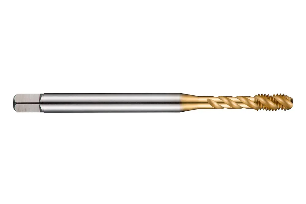 Метчик со спиральной канавкой и фаской формы C, с шагом 2-3xP, для метрической резьбы ISO M5 с шагом 0,80 мм и классом точности 6H, размеры по стандарту DIN 371, с хвостовиком 6,0 мм и квадратным приводом 4,9 мм, из порошковой стали HSS-E с покрытием TiN и углом наклона винтовой линии 45° для нарезания резьбы в глухих отверстиях диаметром 2,5xD в стали и стальном литье, ферритной, мартенситной и аустенитной нержавеющей стали и алюминиевом литье