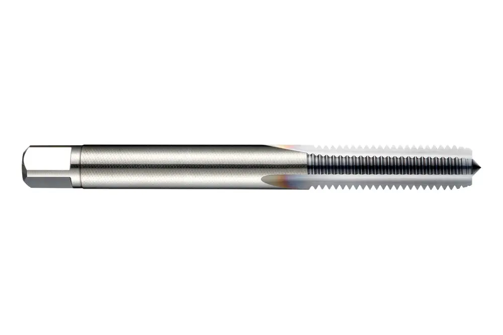 Метчик с прямой канавкой и фаской формы C, с шагом 2-3xP, для метрической резьбы ISO M3 с шагом 0,50 мм и классом точности 6H, размеры по стандарту DIN 371, с хвостовиком 3,5 мм и квадратным приводом 2,7 мм, цельный твердосплавный с покрытием TiCN для нарезания сквозной или глухой резьбы 2xD в отбеленной или закаленной стали <55HRC