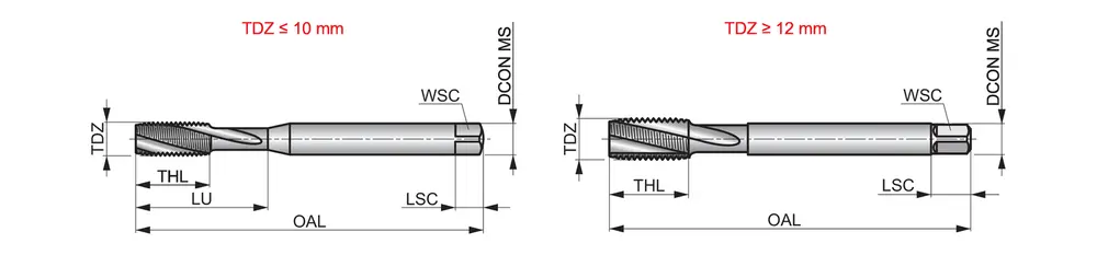 Метчик со спиральной канавкой и фаской формы C, с шагом 2-3xP, для метрической резьбы ISO M5 с шагом 0,80 мм и классом точности 6H, размеры по стандарту DIN 376, с хвостовиком 6,0 мм и квадратным приводом 4,9 мм, цельный твердосплавный с блестящей поверхностью и углом наклона винтовой линии 15° для нарезания резьбы в глухих отверстиях 2xD в ковком, высокопрочном, аустенитном или отпущенном чугуне с шаровидным графитом и вермикулярным графитом, а также литом из алюминия.