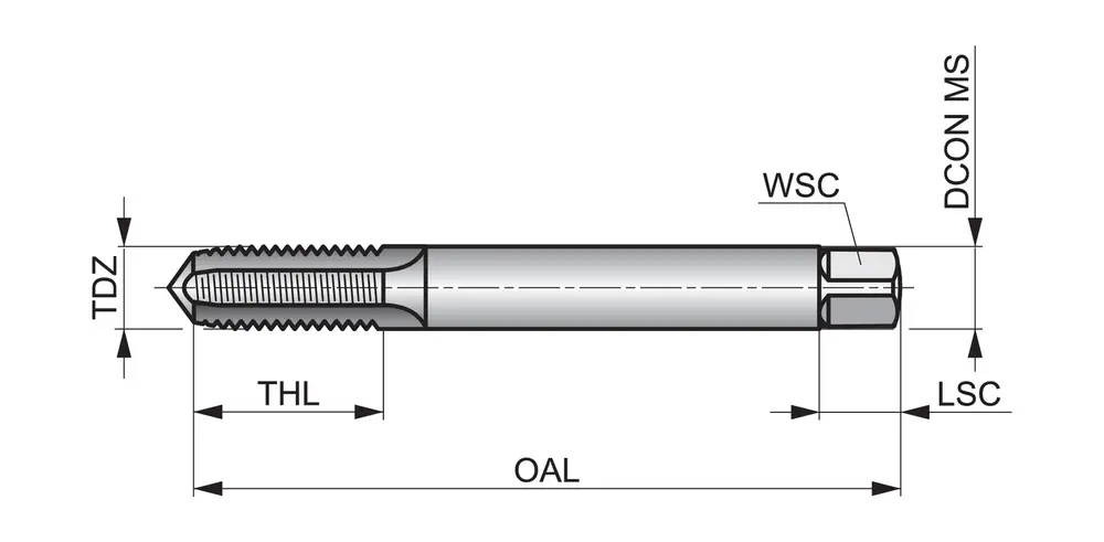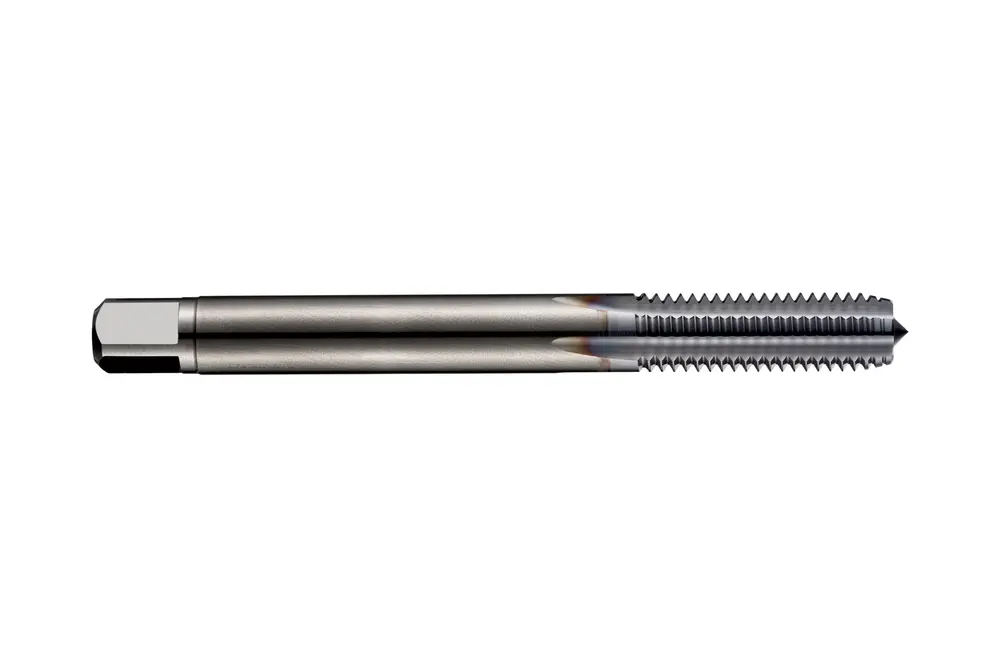 Метчик с прямой канавкой и фаской формы C, с шагом 2-3xP, для метрической резьбы ISO M10 с шагом 1,50 мм и классом точности 6HX, размеры по стандарту DIN 371, с хвостовиком 10,0 мм и квадратным приводом 8,0 мм, цельный твердосплавный с покрытием TiCN для нарезания сквозной или глухой резьбы 2xD в закаленной стали >55HRC