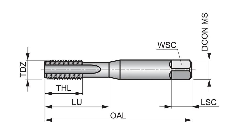 Метчик ручной с прямой канавкой №3 с шлицем 2-3xP, для резьбы Британской ассоциации BA 5 с шагом 0,59 мм и нормальным классом точности, размеры по стандарту ISO 529 с хвостовиком 3,15 мм и квадратным приводом 2,5 мм, из быстрорежущей стали с блестящей отделкой для нарезания резьбы 1,5xD в сквозных или глухих отверстиях в станках с ЧПУ и в углеродистой стали без покрытия.