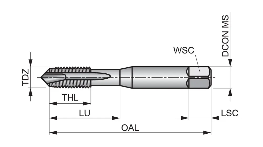 Метчик со спиральной канавкой и фаской формы B, со вторым заходом 3,5-5xP, для резьбы Британской ассоциации BA 4 с шагом 0,66 мм и нормальным классом посадки, размеры по стандарту ISO 529, с хвостовиком 3,55 мм и квадратным приводом 2,8 мм, из быстрорежущей стали с обработанной паром поверхностью для нарезания резьбы 2,5xD в сквозных отверстиях из обычной углеродистой и легированной стали, а также из ферритной и аустенитной нержавеющей стали.
