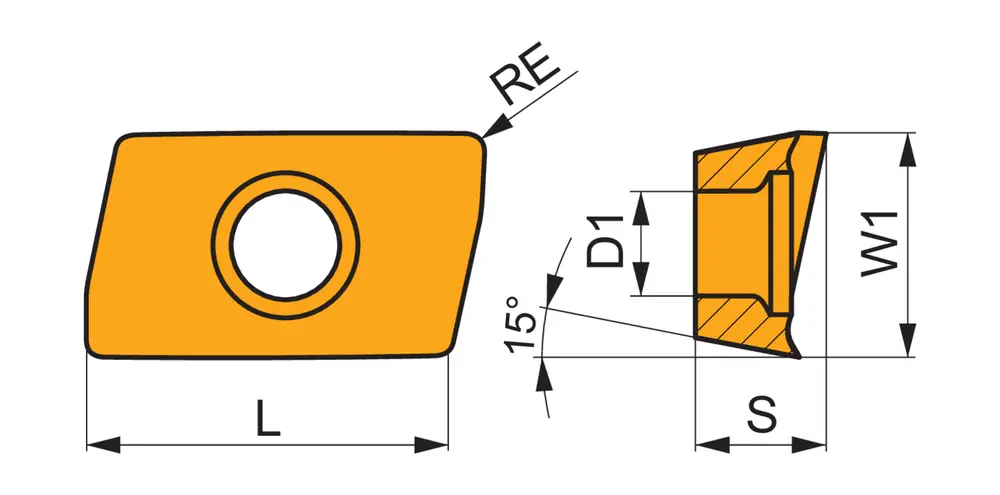 Односторонняя фрезерная пластина ADEX 11T3, параллелограмм 85° для максимальной глубины резания 9,0 мм, с радиусом угла 0,8 мм, точностью индексации в соответствии с классом допуска ISO-E и геометрией FA с острыми режущими кромками, мелкозернистый карбид WC-Co без покрытия HF7 в диапазоне классов прочности ISO N10 - N25 для обработки цветных металлов фрезами с уступами SAD11E или фрезами с уступами с удлиненной канавкой J(T)-SAD11E