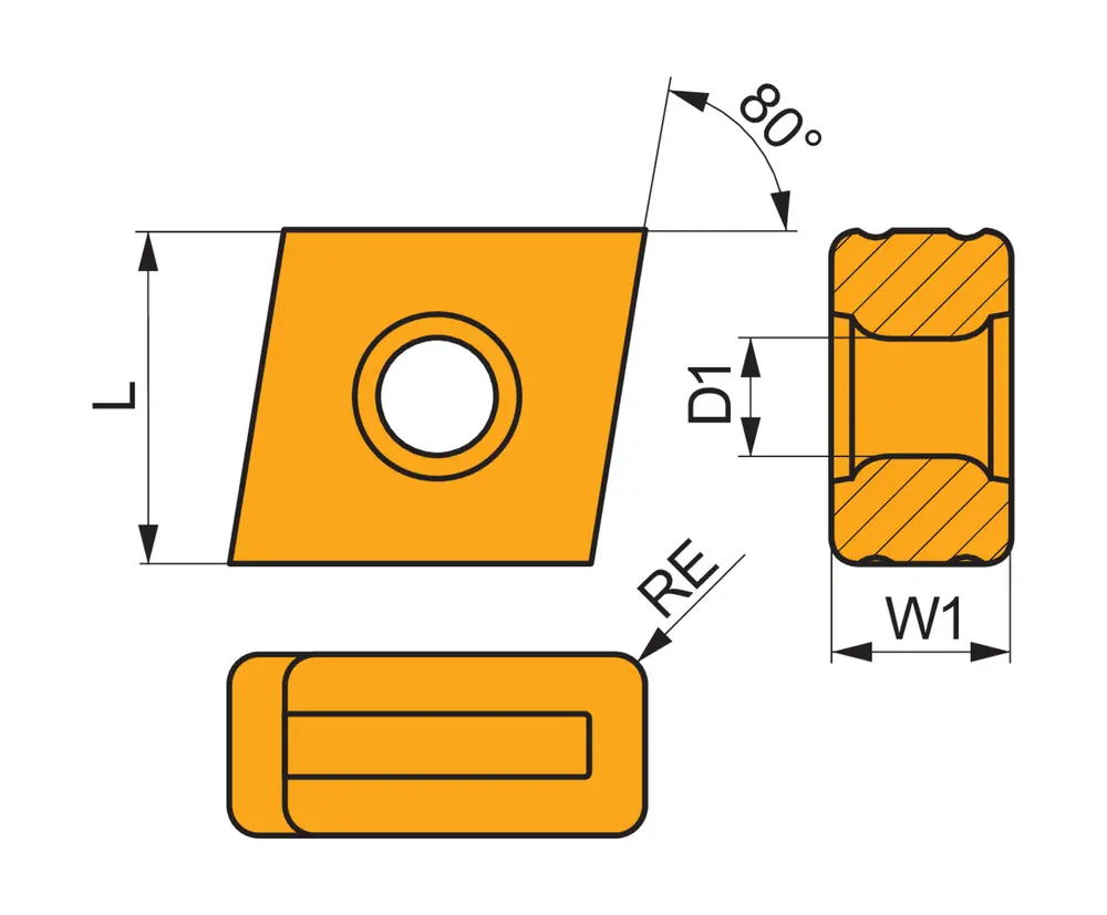 Двухсторонняя фрезерная пластина CNM 563, ромбовидная 80° для максимальной глубины резания 14,0 мм, с радиусом угла 1,2 мм, точность индексации в соответствии с классом допуска ISO-M, мелкозернистый карбид WC-Co с покрытием PVD M8340 в диапазоне классов прочности ISO P25 -P50 для обработки стали