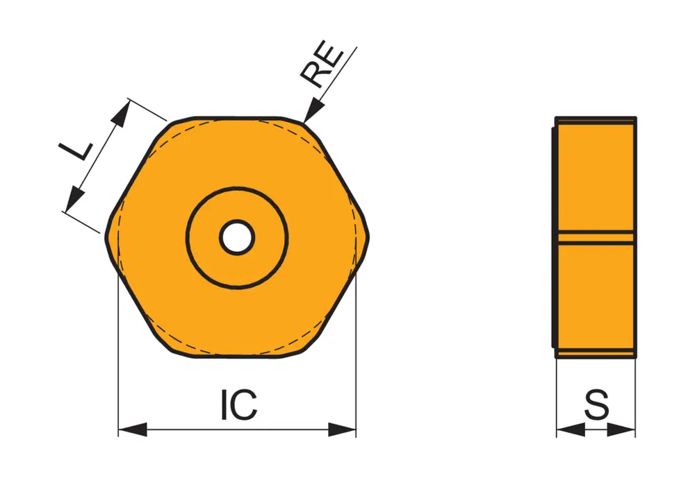 Двухсторонняя фрезерная пластина HNEF 0905DNF со стружколомами, шестигранная для максимальной глубины резания 3,0 мм, с радиусом при вершине 0,4 мм, точностью индексации в соответствии с классом допуска ISO-E и геометрией F с острыми режущими кромками, карбид WC-Co с покрытием MT-CVD M5315 в диапазоне классов прочности ISO K05 -K25 для обработки чугуна торцевыми фрезами CHN09