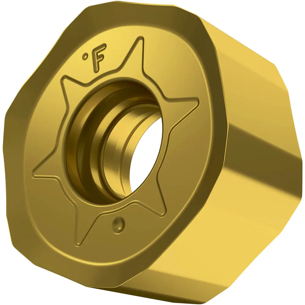 Двухсторонняя фрезерная пластина HNGX 0604, шестигранная для максимальной глубины резания 3,0 мм, с точностью индексации в соответствии с классом допуска ISO-G и геометрией F со скругленными режущими кромками и фаской, карбид WC-Co с покрытием PVD M6330 в диапазоне ISO P20 -P35 для обработки стали торцевыми фрезами SHN06C