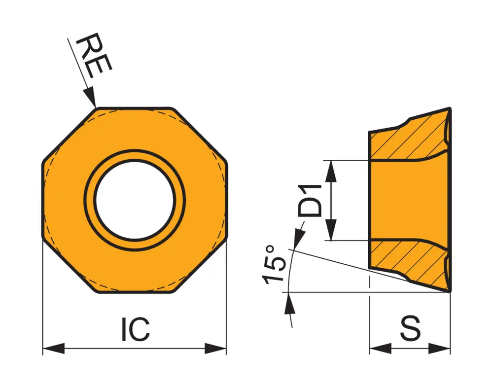 Односторонняя фрезерная пластина ODMT 0505 со стружколомами, восьмиугольная для максимальной глубины резания 3,0 мм, с радиусом угла 0,8 мм, точностью индексации в соответствии с классом допуска ISO-M и геометрией R со скругленными режущими кромками и фаской, мелкозернистый карбид WC-Co с покрытием PVD M8330 в диапазонах ISO P20 -P40 и K20 -K40 для обработки стали и чугуна копировальными фрезами SOD05