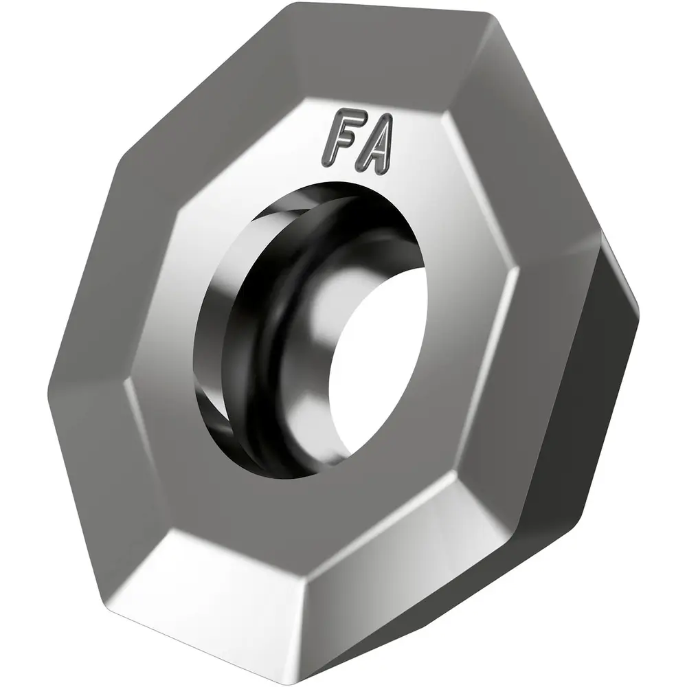 Односторонняя фрезерная пластина OEHT 0604 со стружколомами, восьмигранная для максимальной глубины резания 3,3 мм, с точностью индексации в соответствии с классом допуска ISO-H и геометрией FA с острыми режущими кромками, мелкозернистый карбид WC-Co с покрытием PVD M0315 в диапазоне классов прочности ISO N05 -N25 для обработки цветных металлов торцевыми фрезами SOE06Z