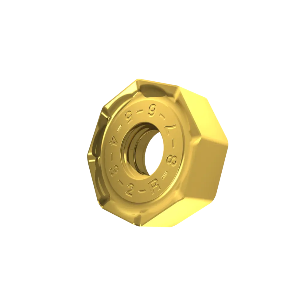 Двухсторонняя фрезерная пластина ONMX 0605, восьмиугольная для максимальной глубины резания 4 мм, с радиусом угла 0,8 мм, точностью индексации в соответствии с классом допуска ISO-M и геометрией R со скругленными режущими кромками и фаской, мелкозернистый карбид WC-Co с покрытием PVD M8330 в диапазонах ISO P20 -P40 и K20 -K40 для обработки стали и чугуна торцевыми фрезами SON06C