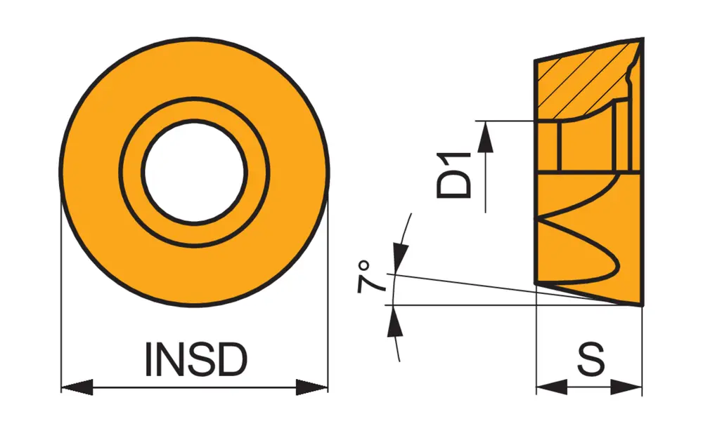 Односторонняя фрезерная пластина RCMT 10T3 со стружколомами, круглая для максимальной глубины резания 5,0 мм, с точностью индексации в соответствии с классом допуска ISO-M и геометрией F со скругленными режущими кромками и фаской, мелкозернистый карбид WC-Co с покрытием PVD M8340 в диапазонах ISO P25 -P50/M20 -M40 и S20 -S30 для обработки стали, нержавеющей стали и суперсплава фрезами с копировальным торцом SRC10