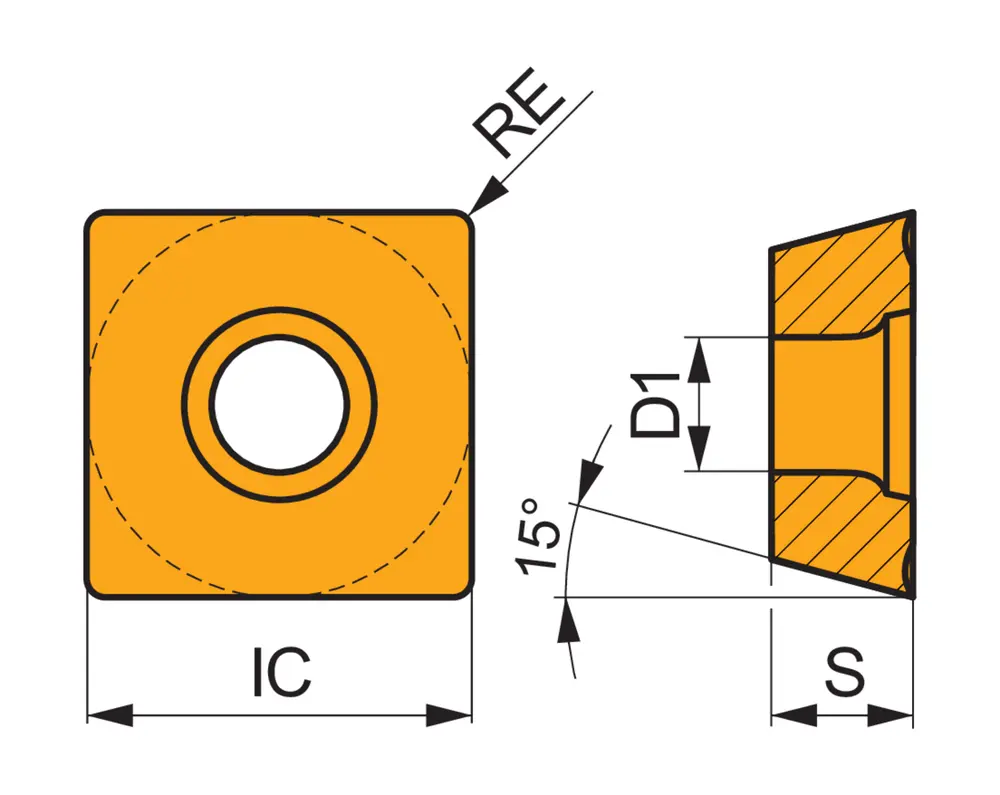 Односторонняя фрезерная пластина SDEX 0903, квадратная для максимальной глубины резания 4,5 мм, с радиусом угла 0,8 мм, точностью индексации в соответствии с классом допуска ISO-E и геометрией 74 с острыми режущими кромками, мелкозернистый карбид WC-Co с покрытием PVD M8330 в диапазоне классов прочности ISO P20 -P40 для обработки стали фасочными фрезами SSD09