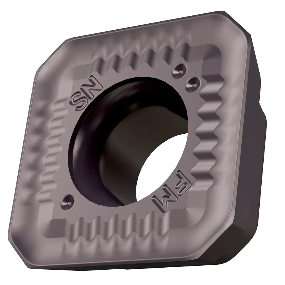 Односторонняя фрезерная пластина SDMT 1205 со стружколомами, квадратная для максимальной глубины резания 10,0 мм, с радиусом угла 0,8 мм, точностью индексации в соответствии с классом допуска ISO-M и геометрией FM со скругленными режущими кромками и фаской, карбид WC-Co с покрытием PVD M8345 в диапазоне ISO P30-P50 для обработки стали фрезами с копировальным торцом SOD05