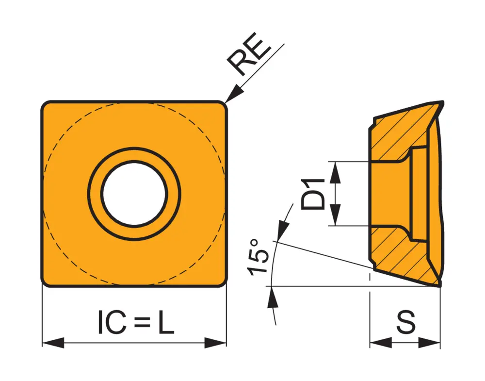 Односторонняя фрезерная пластина SDMT 1205 со стружколомами, квадратная для максимальной глубины резания 10,0 мм, с радиусом угла 0,8 мм, точностью индексации в соответствии с классом допуска ISO-M и геометрией M со скругленными режущими кромками и фаской, мелкозернистый карбид WC-Co с покрытием PVD M8340 в диапазонах ISO P25 -P50 и M20 -M40 для обработки стали и нержавеющей стали фрезами SSD12 с уступом