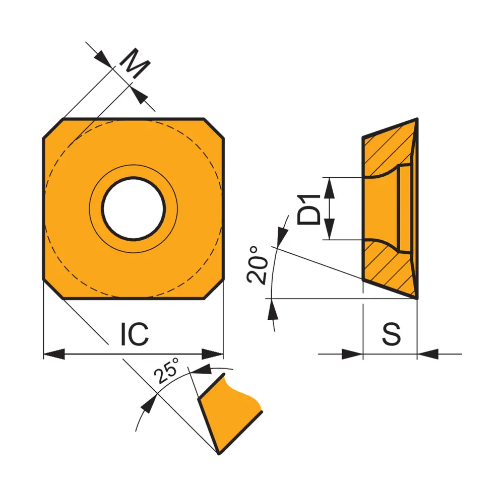Односторонняя фрезерная пластина SEET 12T3 со стружколомами, квадратная для максимальной глубины резания 6,5 мм, с точностью индексации в соответствии с классом допуска ISO-E и геометрией PM со скругленными режущими кромками и двухгранной фаской, мелкозернистый карбид WC-Co с покрытием PVD M8340 в диапазоне классов прочности ISO P25 - P50 для обработки стали