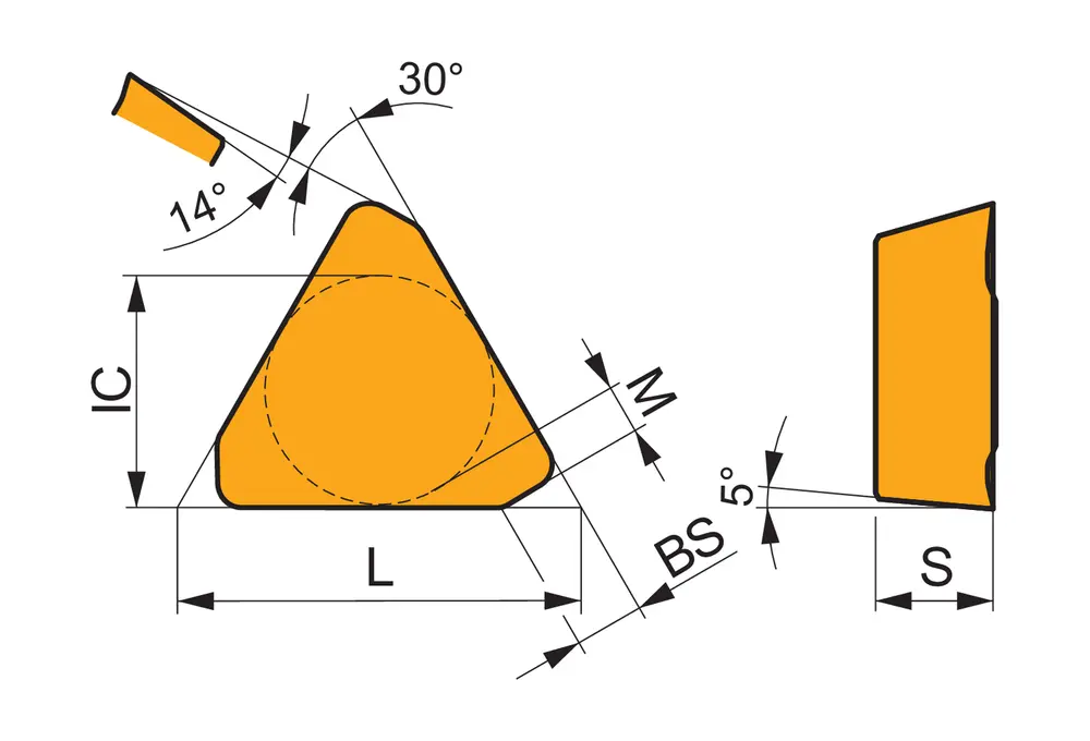 Односторонняя фрезерная пластина TBMR 2707 со стружколомами, треугольной формы для максимальной глубины резания 18,0 мм, с точностью индексации в соответствии с классом допуска ISO-M со скругленными режущими кромками и фаской, карбид WC-Co с покрытием PVD M8346 в диапазоне ISO P30-P50 для обработки стали фрезами с уступами FTB27X