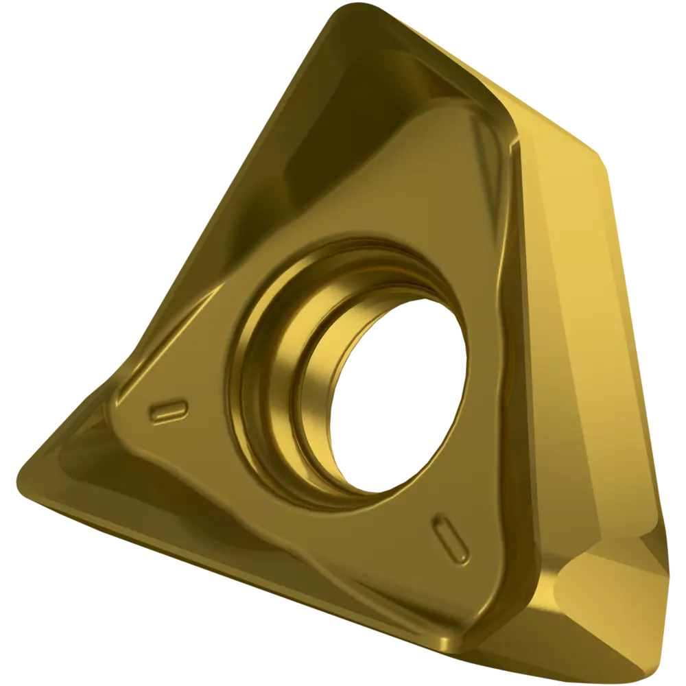 Двухсторонняя фрезерная пластина TNGX 1606, треугольная для максимальной глубины резания 10,0 мм, с радиусом угла 0,4 мм, точностью индексации в соответствии с классом допуска ISO-G и геометрией M со скругленными режущими кромками и фаской, мелкозернистый карбид WC-Co с покрытием PVD M8340 в диапазоне ISO P25 -P50 для обработки стали торцевыми фрезами STN16