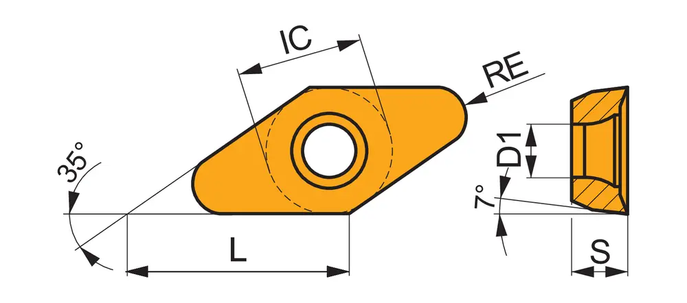 Односторонняя фрезерная пластина VCGT 2205 со стружколомами, ромбовидная 35° для максимальной глубины резания 18,0 мм, с радиусом при вершине 2,0 мм, точностью индексации в соответствии с классом допуска ISO-G и геометрией FA с острыми режущими кромками, мелкозернистый карбид WC-Co HF7 без покрытия в диапазоне прочности ISO N10 - N25 для обработки цветных металлов концевыми фрезами SVC22C