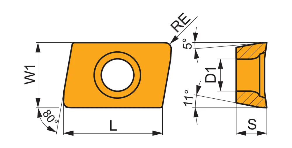 Односторонняя фрезерная пластина XPHT 1604 со стружколомами, ромбовидная 80° для максимальной глубины резания 15,0 мм, с радиусом угла 1,2 мм, точностью индексации в соответствии с классом допуска ISO-H со скругленными режущими кромками, мелкозернистый карбид WC-Co с покрытием PVD M8340 в диапазонах ISO P25 - P50 и M20 - M40 для обработки стали и нержавеющей стали
