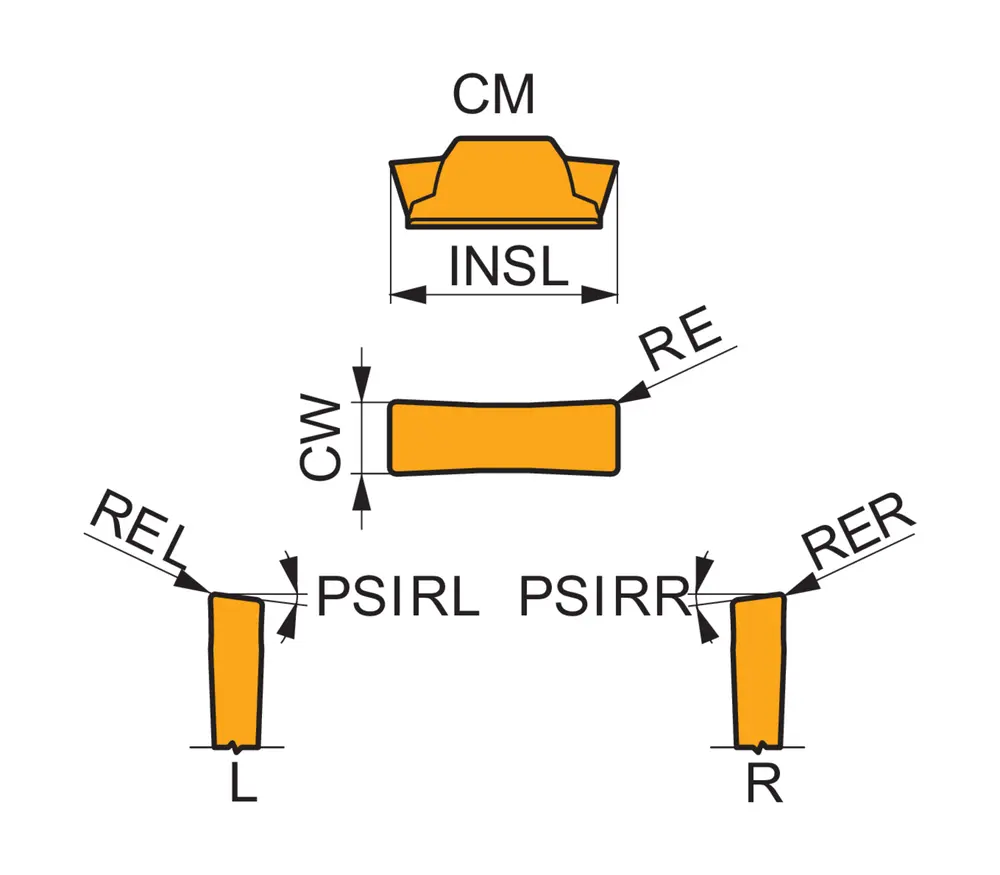 Двухсторонняя отрезная и канавочная пластина длиной 16,4 мм с шириной режущей кромки 3 мм и радиусом при вершине 0,2 мм, точность по классу допуска M и стружколом CM, сорт T8330, мелкозернистый карбид WC-Co с покрытием PVD в диапазонах ISO P25-P40 и K20-K40 для обработки стали и чугуна в сочетании с инструментами для отрезки и канавки DORMER PRAMET GF..(RL) 03, GG..(RL) 03 и XLCCN 0316