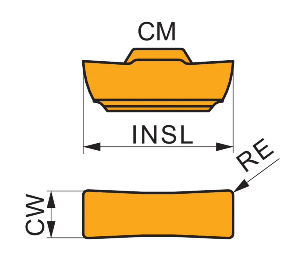Двухсторонняя отрезная и канавочная пластина длиной 12,6 мм с шириной режущей кромки 4 мм и радиусом при вершине 0,4 мм, точность по классу допуска M и стружколом CM, сорт T8330, мелкозернистый карбид WC-Co с покрытием PVD в диапазонах ISO P25-P40 и K20-K40 для обработки стали и чугуна в сочетании с инструментами для отрезки и канавки DORMER PRAMET GF..(RL) 0413 и GG..(RL) 0413