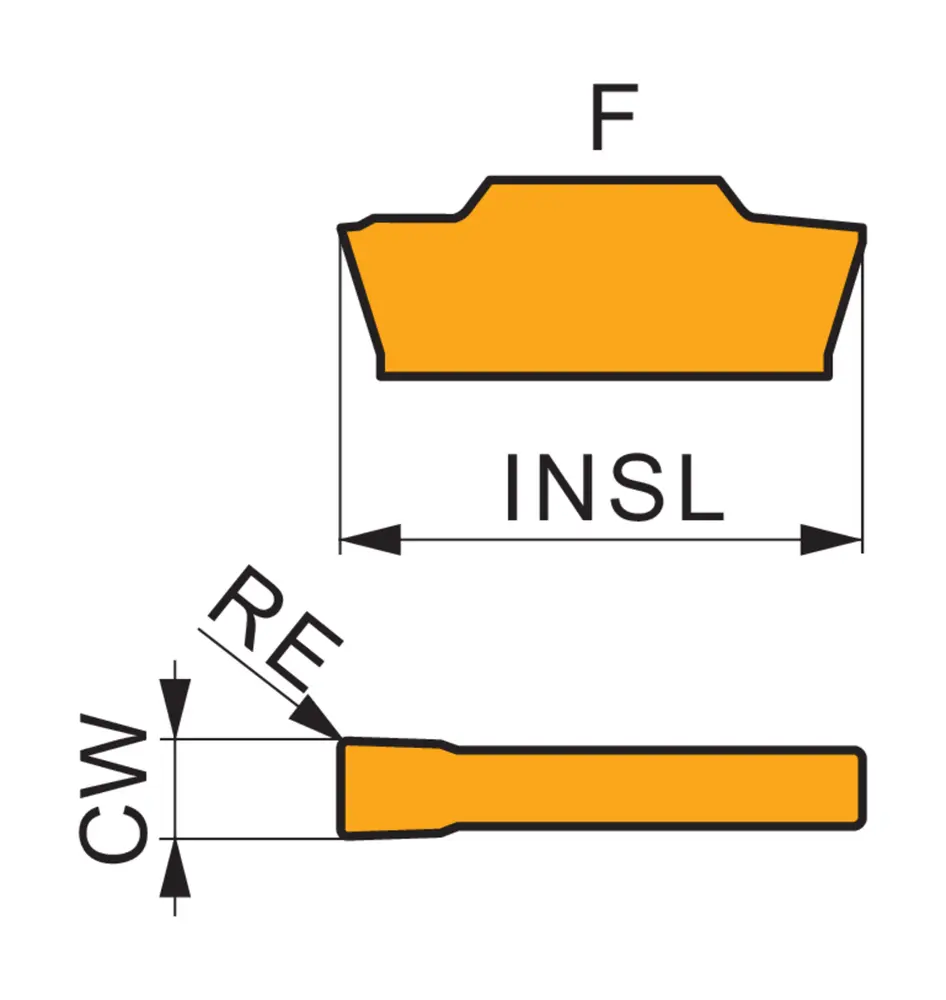 Односторонняя отрезная и канавочная пластина длиной 16,4 мм с шириной режущей кромки 4 мм и радиусом при вершине 0,4 мм, точность в соответствии с классом допуска M и стружколомом F, сорт T8330, мелкозернистый карбид WC-Co с покрытием PVD в диапазонах ISO P25-P40 и M20-M35 для обработки стали и нержавеющей стали в сочетании с инструментами для отрезки и канавки DORMER PRAMET GF..(RL) 04, GG..(RL) 04 и XLCCN 0416