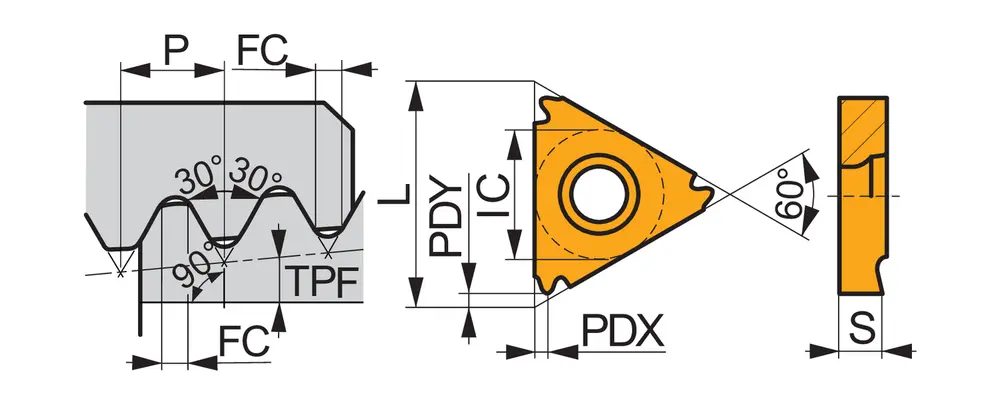 Односторонняя резьбонарезная пластина, треугольная с диаметром вписанной окружности 9,525 мм, для правостороннего нарезания внутренней резьбы API с мелкозернистым карбидом WC-Co с покрытием PVD T8030 в диапазонах ISO P25-P40/M20-M35 и K20-K40 для обработки стали, нержавеющей стали и чугуна.