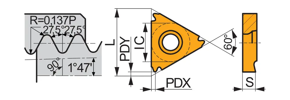 Односторонняя резьбонарезная пластина, треугольная с диаметром вписанной окружности 9,525 мм, для правостороннего нарезания внутренней резьбы BSPT с мелкозернистым карбидом WC-Co с покрытием PVD 11TPI T8030 в диапазонах ISO P25-P40/M20-M35 и K20-K40 для обработки стали, нержавеющей стали и чугуна.