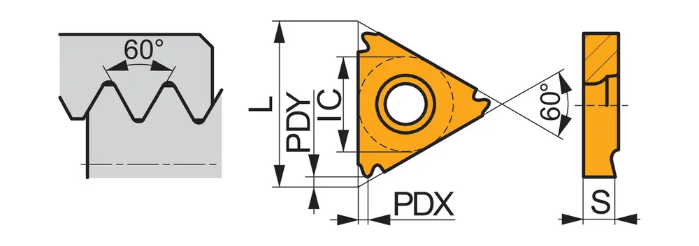 Односторонняя резьбонарезная пластина, треугольная с диаметром вписанной окружности 9,525 мм, для правостороннего частичного профиля внутренней метрической и UN резьбы ISO с шагом от 1,75 до 3 мм и числом витков на дюйм от 14 до 8, из мелкозернистого твердого сплава WC-Co с покрытием PVD T8030 в диапазонах ISO P25-P40/M20-M35 и K20-K40 для обработки стали, нержавеющей стали и чугуна.