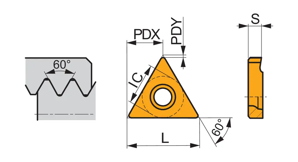 Односторонняя резьбонарезная пластина, треугольная с диаметром вписанной окружности 12,7 мм, для правого и левого нарезания частичного профиля метрической и UN наружной резьбы ISO с шагом от 3,5 до 5 мм и числом витков на дюйм от 7 до 5,0, мелкозернистый карбид WC-Co с покрытием PVD T8030 в диапазонах ISO P25-P40/M20-M35 и K20-K40 для обработки стали, нержавеющей стали и чугуна в сочетании с резьбонарезным резцом SE(RL)-S