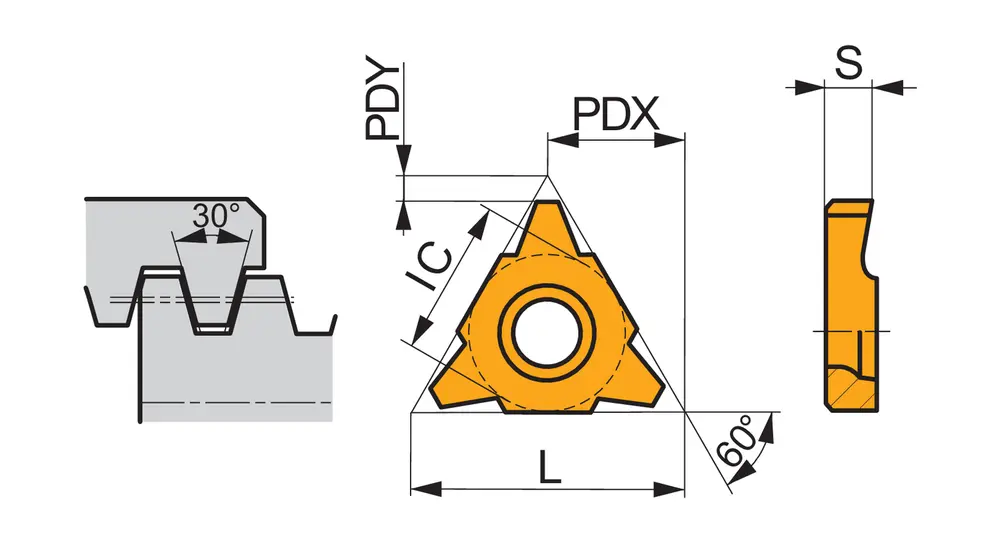 Односторонняя резьбонарезная пластина, треугольная с диаметром вписанной окружности 12,7 мм, для правого и левого нарезания трапецеидальной наружной резьбы TR с шагом 6 мм, мелкозернистый карбид WC-Co с покрытием PVD T8030 в диапазонах ISO P25-P40/M20-M35 и K20-K40 для обработки стали, нержавеющей стали и чугуна в сочетании с резьбонарезным резцом SE(RL)-S