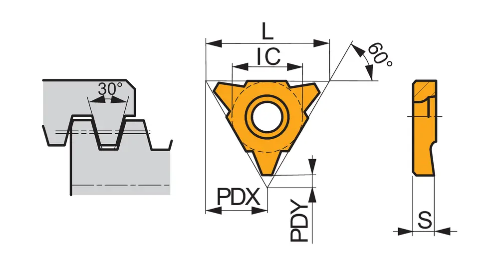Односторонняя резьбонарезная пластина, треугольная с диаметром вписанной окружности 12,7 мм, для правого и левого нарезания трапецеидальной внутренней резьбы TR с шагом 7 мм, мелкозернистый карбид WC-Co с покрытием PVD T8030 в диапазонах ISO P25-P40/M20-M35 и K20-K40 для обработки стали, нержавеющей стали и чугуна в сочетании с резьбонарезным резцом SI(RL)-S
