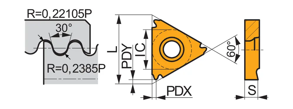 Односторонняя резьбонарезная пластина, треугольная с диаметром вписанной окружности 12,7 мм, для правостороннего нарезания внутренней резьбы RD с мелкозернистым карбидом WC-Co с покрытием PVD 6TPI T8030 в диапазонах ISO P25-P40/M20-M35 и K20-K40 для обработки стали, нержавеющей стали и чугуна.