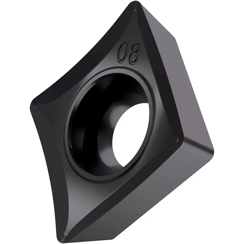 Односторонняя позитивная токарная пластина, ромб 80° с зазором 7°, диаметр вписанной окружности 6,35 мм, толщина 2,38 мм, радиус вершины 0,2 мм, точность индексации в соответствии с классом допуска ISO-G, стружколом SF3 со скругленными режущими кромками, из сплава T6310, сверхмелкозернистый карбид WC-Co с покрытием PVD в диапазонах ISO M01 -M15/N05 -N20 и S01 -S15, для чистовой и средней обработки нержавеющих сталей, цветных металлов и суперсплавов.