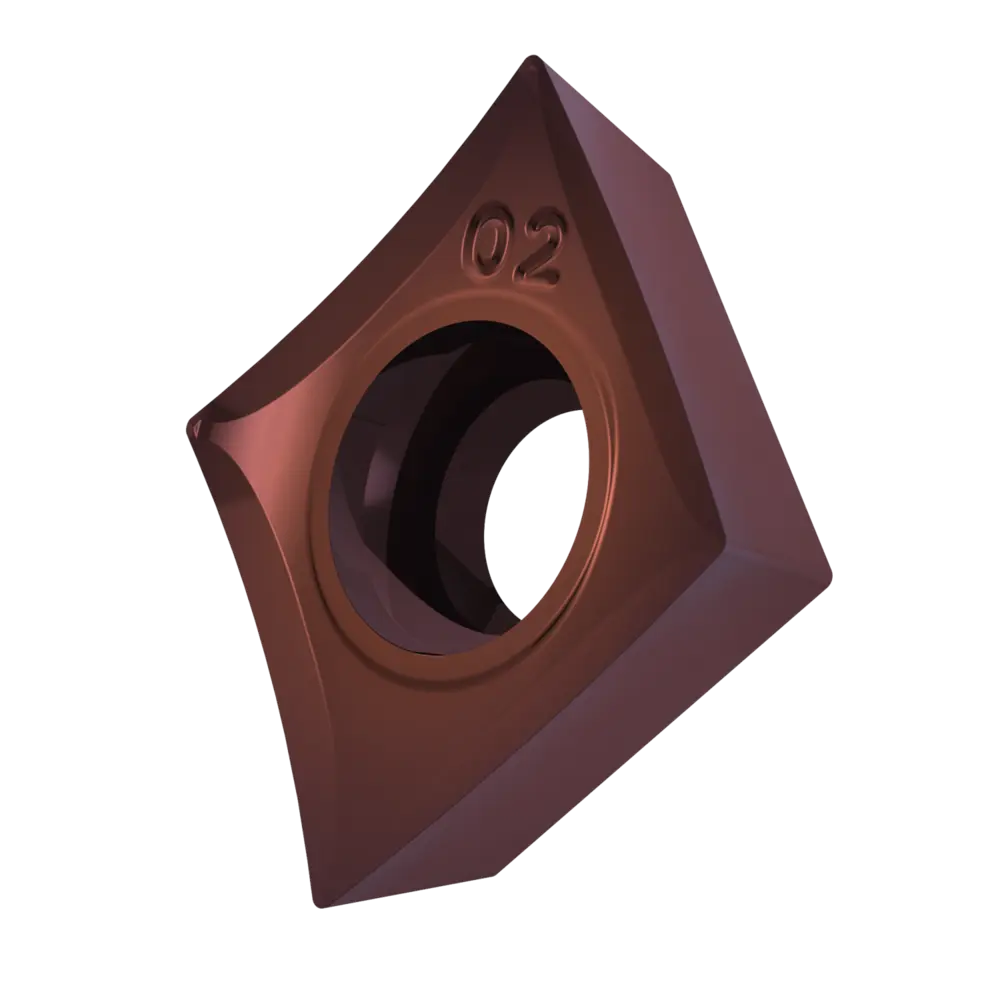 Односторонняя позитивная токарная пластина, ромб 80° с зазором 7°, диаметр вписанной окружности 7,94 мм, толщина 3,18 мм, радиус при вершине 0,4 мм, точность индексации в соответствии с классом допуска ISO-G, стружколом SF3 со скругленными режущими кромками, из сплава T8415.