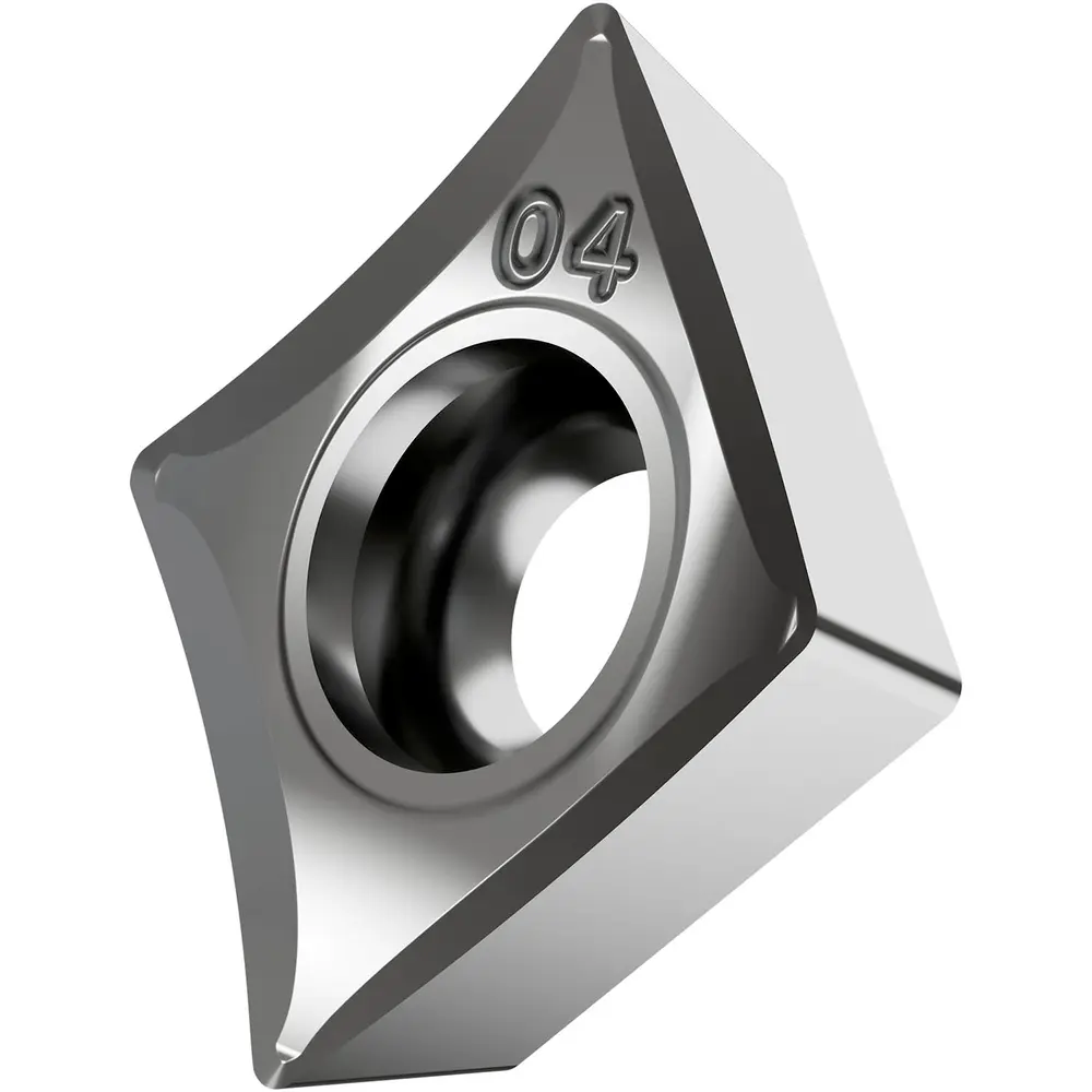 Односторонняя позитивная токарная пластина, ромб 80° с зазором 7°, диаметр вписанной окружности 7,94 мм, толщина 3,18 мм, радиус вершины 0,4 мм, точность индексации в соответствии с классом допуска ISO-G, стружколом AL с острыми режущими кромками, из сплава T0315, мелкозернистого твердого сплава WC-Co с покрытием PVD в диапазоне ISO N05 -N20, для чистовой и тяжелой обработки цветных металлов.