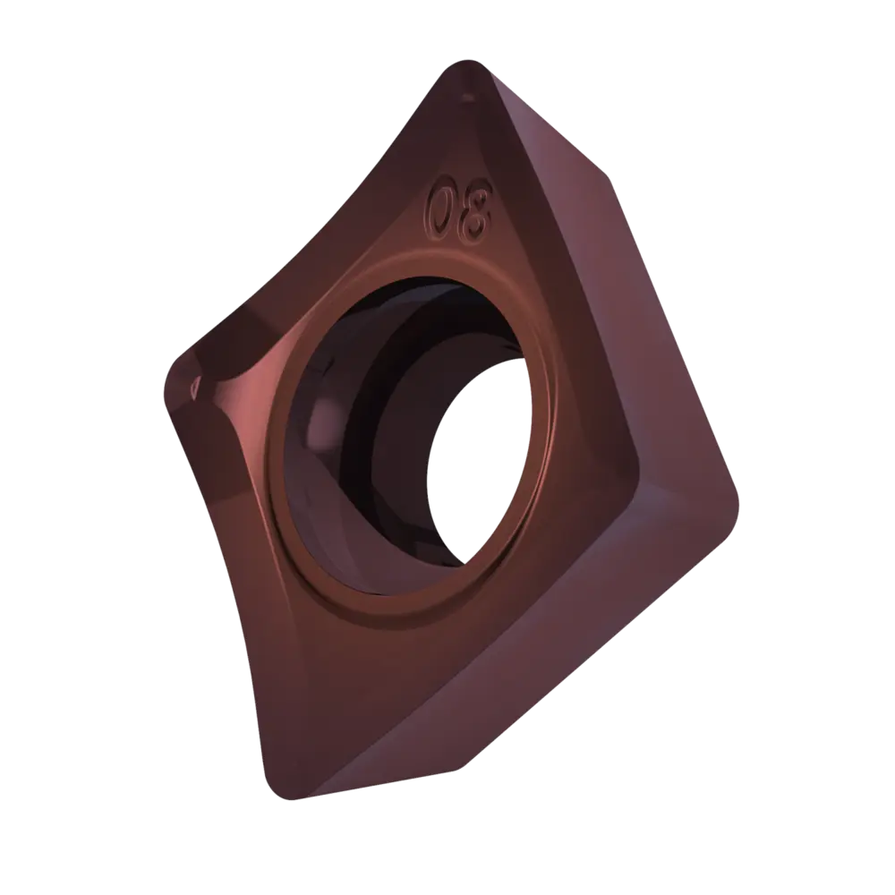 Односторонняя позитивная токарная пластина, ромб 80° с зазором 7°, диаметр вписанной окружности 9,525 мм, толщина 3,97 мм, радиус при вершине 0,2 мм, точность индексации в соответствии с классом допуска ISO-G, стружколом SF3 со скругленными режущими кромками, из сплава T8415.