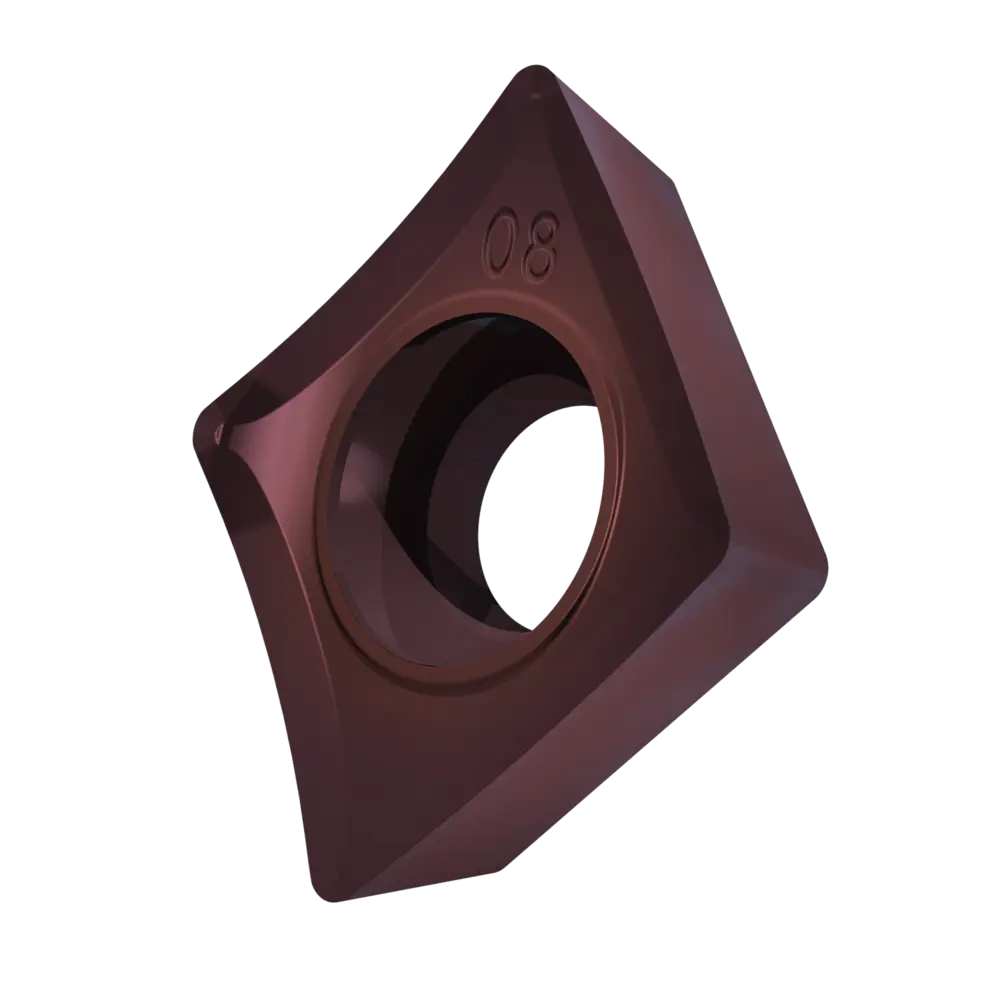 Односторонняя позитивная токарная пластина, ромб 80° с зазором 7°, диаметр вписанной окружности 12,7 мм, толщина 4,76 мм, радиус при вершине 0,8 мм, точность индексации в соответствии с классом допуска ISO-G, стружколом SF3 со скругленными режущими кромками, из сплава T8415.