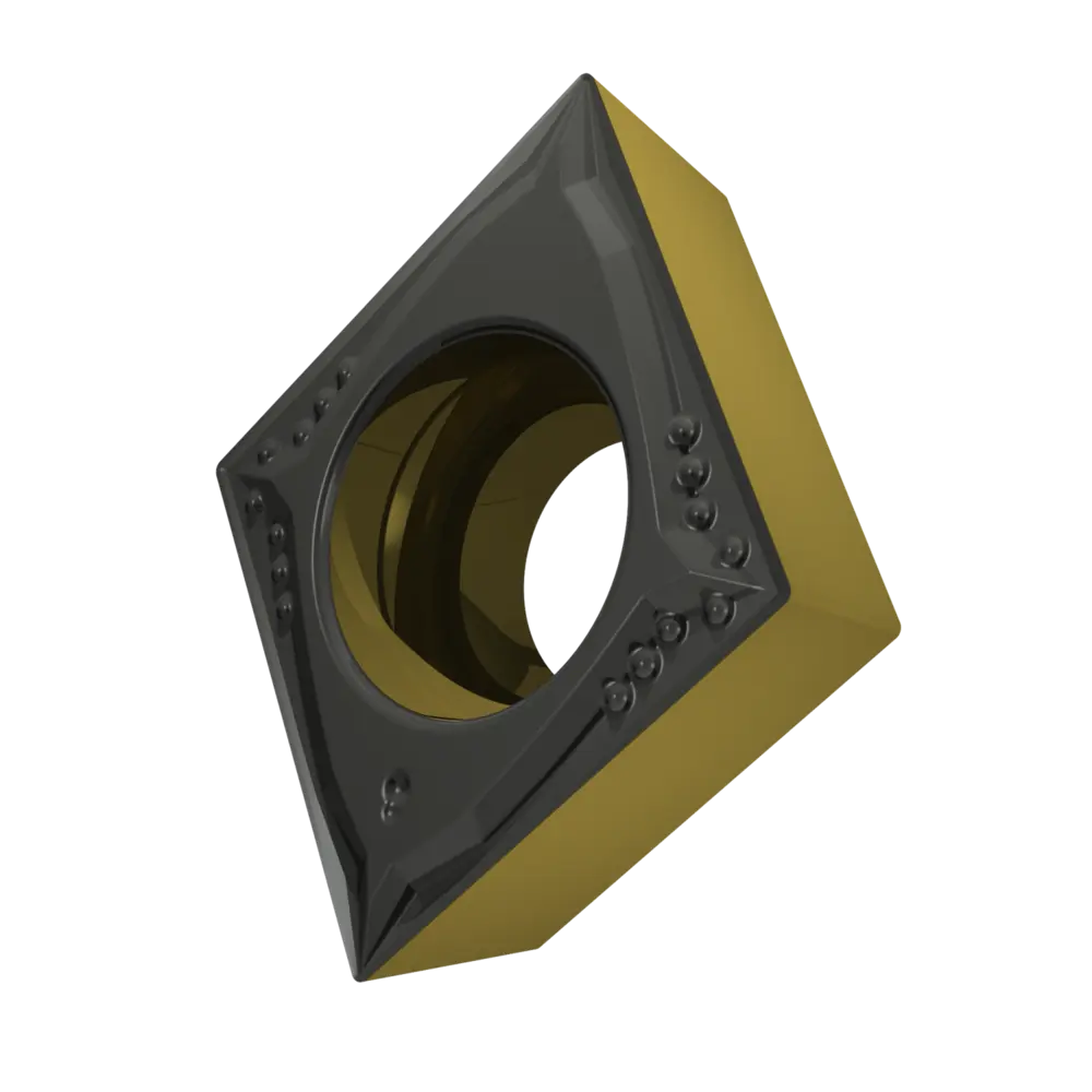 Односторонняя позитивная токарная пластина, ромбовидная 80° с зазором 7°, диаметр вписанной окружности 9,525 мм, толщина 3,97 мм, радиус вершины 0,2 мм, точность индексации в соответствии с классом допуска ISO-M, стружколом FM со скругленными режущими кромками, из сплава T9415, функционально-градуированного твердого сплава WC-Co с покрытием MT-CVD в диапазоне ISO P05 -P30, для чистовой и получистовой обработки сталей.