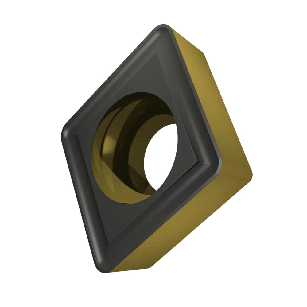 Односторонняя позитивная токарная пластина, ромбовидная 80° с зазором 7°, диаметр вписанной окружности 12,7 мм, толщина 4,76 мм, радиус вершины 1,2 мм, точность индексации в соответствии с классом допуска ISO-M, стружколом RM3 со скругленными режущими кромками, из сплава T9415, функционально-градуированного твердого сплава WC-Co с покрытием MT-CVD в диапазоне ISO P05 -P30, для чистовой и тяжелой обработки сталей