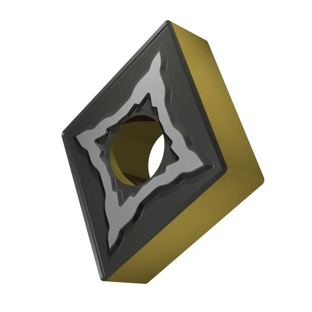 Двусторонняя негативная токарная пластина, ромбовидная 80° с диаметром вписанной окружности 12,7 мм, толщиной 4,76 мм, радиусом при вершине 0,4 мм, точностью индексации в соответствии с классом допуска ISO M, стружколомом NMR со скругленными режущими кромками, из сплава T9415, функционально-градуированного твердого сплава WC-Co с покрытием MT-CVD в диапазоне ISO P05 -P30, для чистовой и тяжелой обработки сталей.