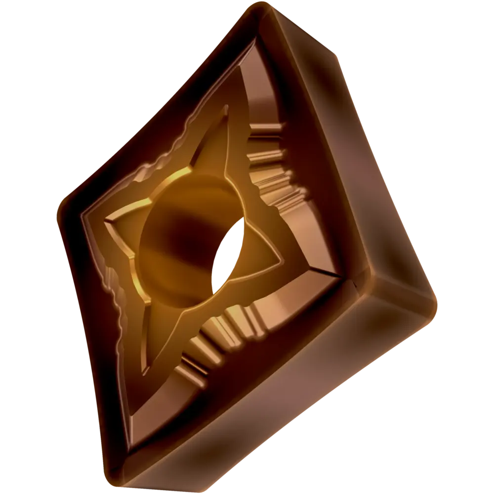 Двусторонняя негативная токарная пластина, ромбовидная 80° с диаметром вписанной окружности 12,7 мм, толщиной 4,76 мм, радиусом при вершине 0,4 мм, точностью индексации в соответствии с классом допуска ISO-M, стружколомом SF со скругленными режущими кромками, из сплава T8415.