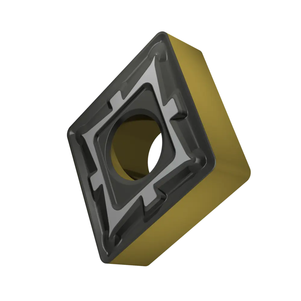 Двусторонняя негативная токарная пластина, ромбовидная 80° с диаметром вписанной окружности 12,7 мм, толщиной 4,76 мм, радиусом при вершине 0,8 мм, точностью индексации в соответствии с классом допуска ISO-M, стружколомом M со скругленными режущими кромками, из сплава T9415, функционально-градуированного твердого сплава WC-Co с покрытием MT-CVD в диапазоне ISO P05 -P30, для чистовой и тяжелой обработки сталей.