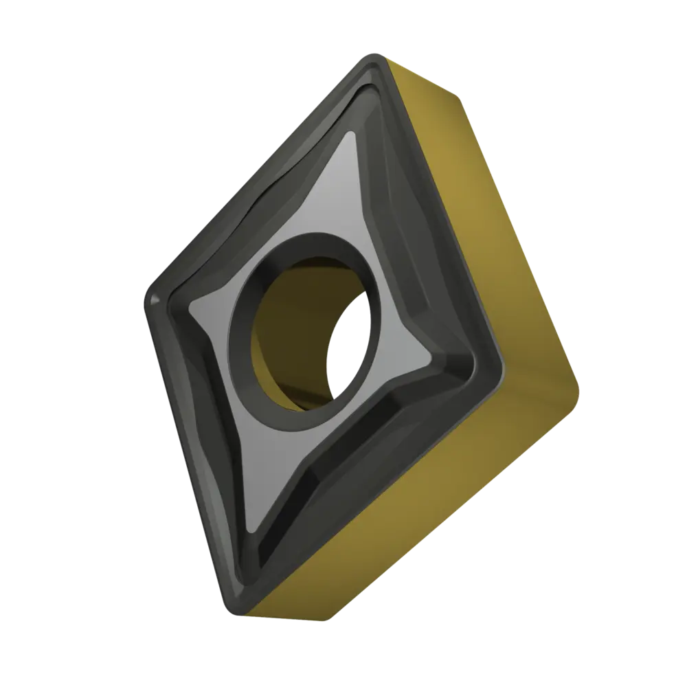 Двусторонняя негативная токарная пластина, ромбовидная 80° с диаметром вписанной окружности 12,7 мм, толщиной 4,76 мм, радиусом при вершине 0,8 мм, точностью индексации в соответствии с классом допуска ISO-M, стружколомом R со скругленными режущими кромками, из сплава T9415, функционально-градуированного твердого сплава WC-Co с покрытием MT-CVD в диапазоне ISO P05 -P30, для средней и тяжелой обработки сталей