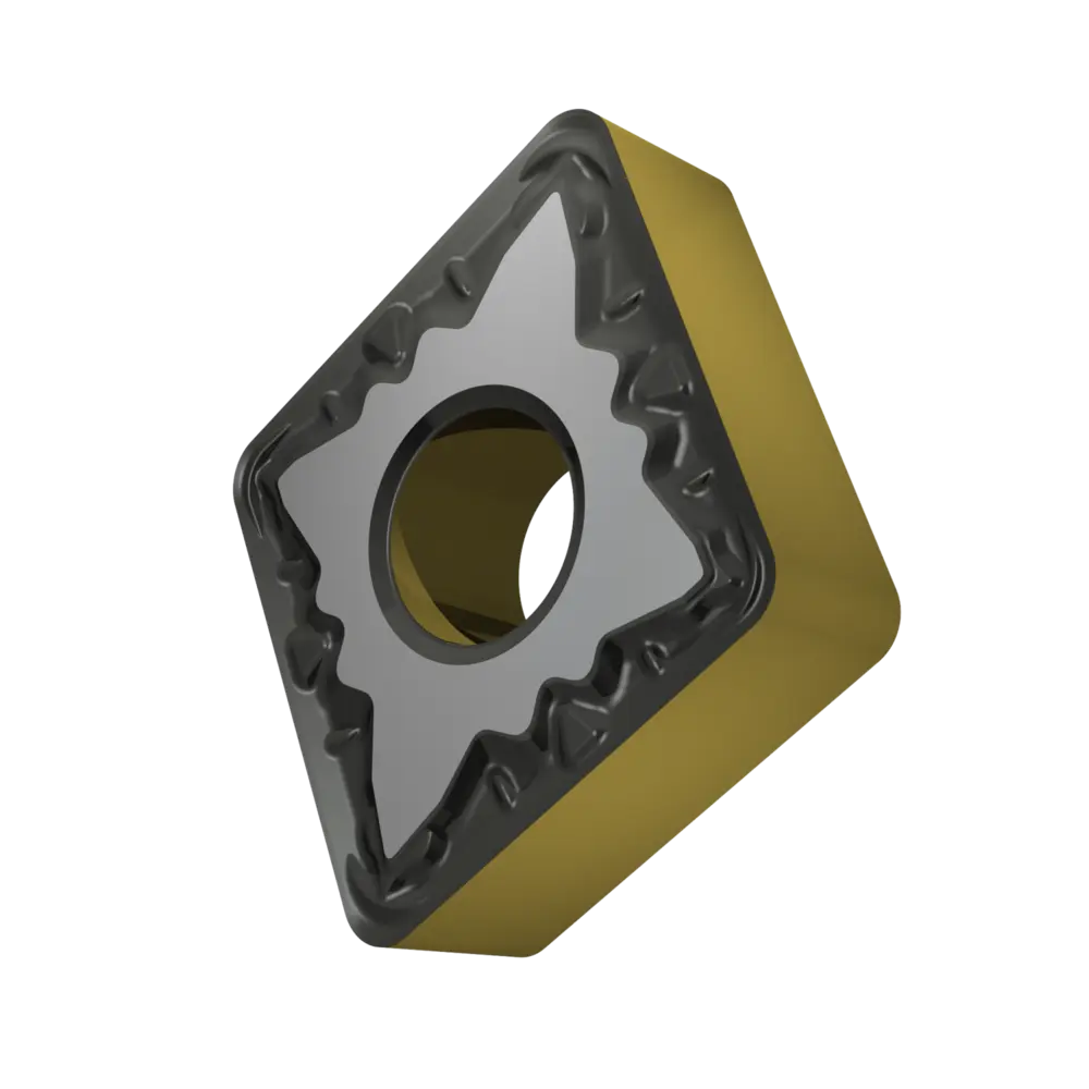 Двусторонняя негативная токарная пластина, ромбовидная 80° с диаметром вписанной окружности 12,7 мм, толщиной 4,76 мм, радиусом при вершине 1,2 мм, точностью индексации в соответствии с классом допуска ISO M, стружколомом FM со скругленными режущими кромками, из сплава T9415, функционально-градуированного твердого сплава WC-Co с покрытием MT-CVD в диапазоне ISO P05 -P30, для чистовой и получистовой обработки сталей.