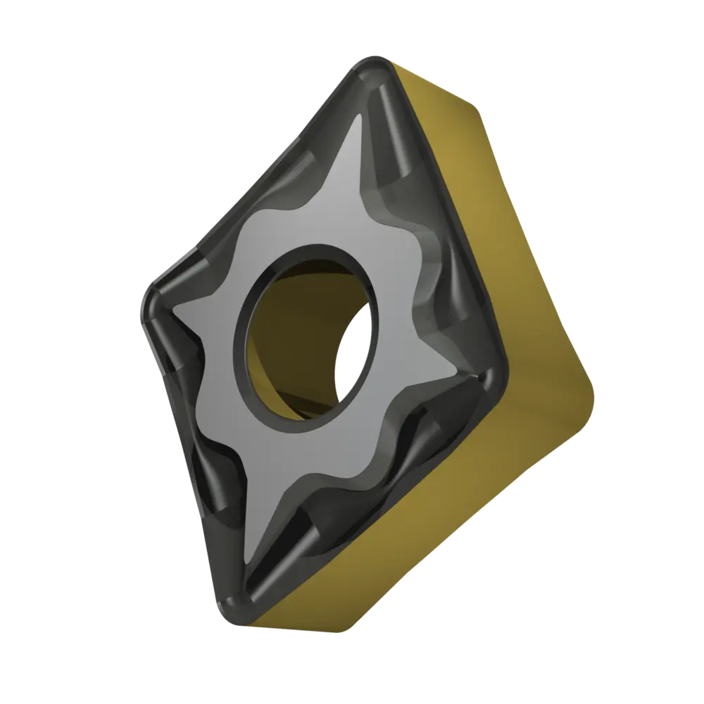 Двусторонняя негативная токарная пластина, ромбовидная 80° с диаметром вписанной окружности 12,7 мм, толщиной 4,76 мм, радиусом при вершине 1,2 мм, точностью индексации в соответствии с классом допуска ISO-M, стружколомом NF со скругленными режущими кромками, из сплава T9415, функционально-градуированного твердого сплава WC-Co с покрытием MT-CVD в диапазоне ISO P05 -P30, для чистовой и получистовой обработки сталей.