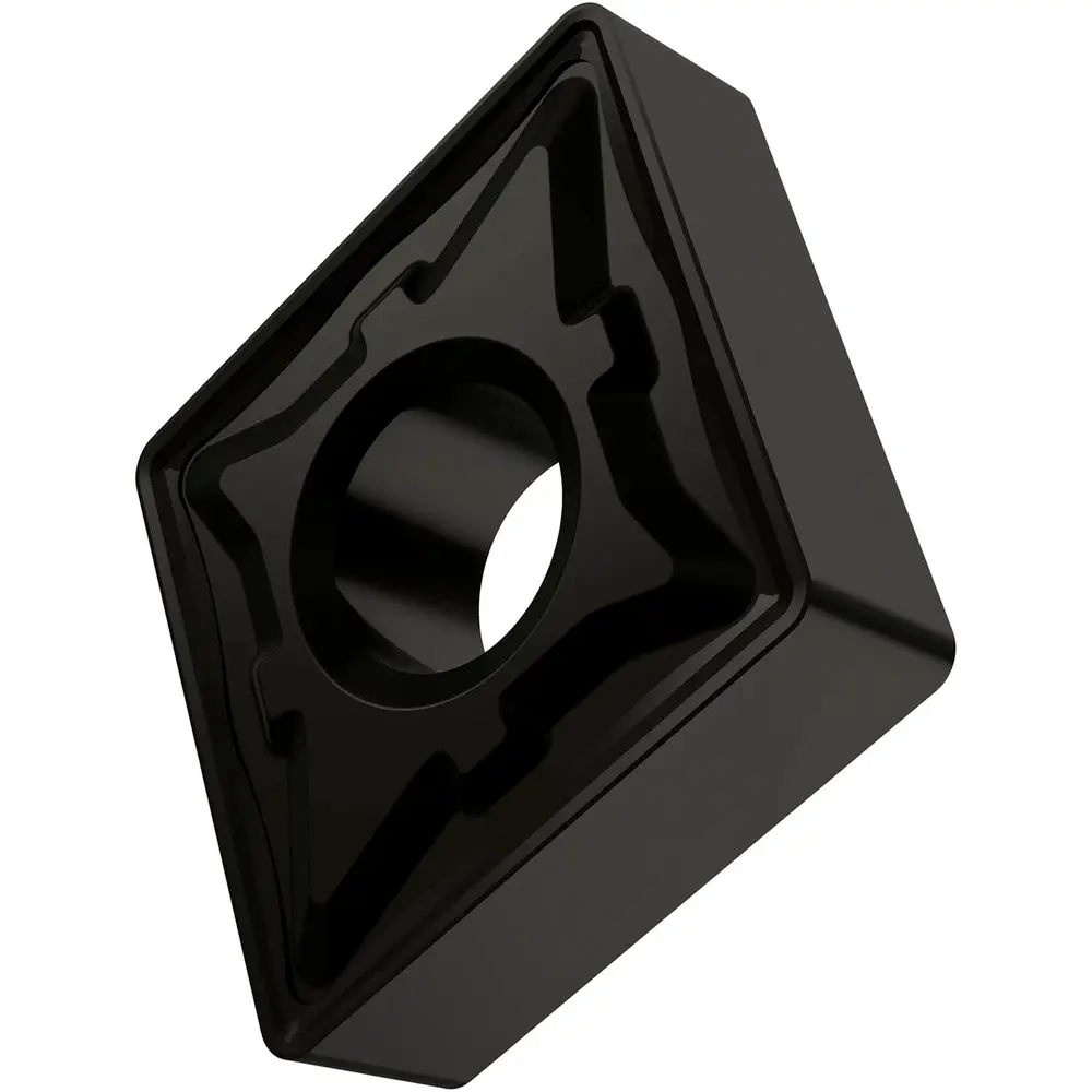 Двусторонняя негативная токарная пластина, ромбовидная 80° с диаметром вписанной окружности 12,7 мм, толщиной 4,76 мм, радиусом при вершине 1,2 мм, точностью индексации в соответствии с классом допуска ISO-M, стружколомом R со скругленными режущими кромками, из сплава T9325, функционально классифицированного твердого сплава WC-Co с покрытием MT-CVD в диапазоне ISO P15 -P35, для средней и тяжелой обработки сталей.