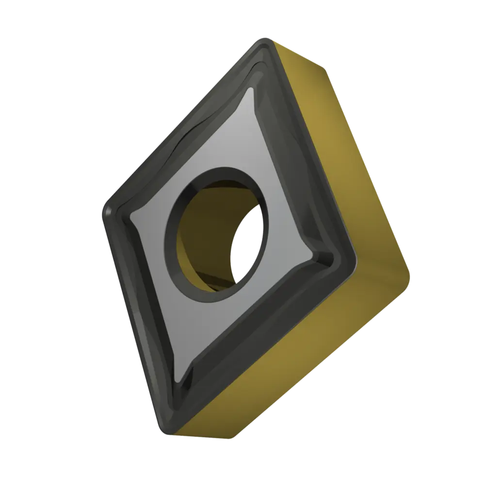 Двусторонняя негативная токарная пластина, ромбовидная 80° с диаметром вписанной окружности 19,05 мм, толщиной 6,35 мм, радиусом при вершине 1,2 мм, точностью индексации в соответствии с классом допуска ISO-M, стружколомом R со скругленными режущими кромками, из сплава T9415, функционально-градуированного твердого сплава WC-Co с покрытием MT-CVD в диапазоне ISO P05 -P30, для средней и тяжелой обработки сталей.